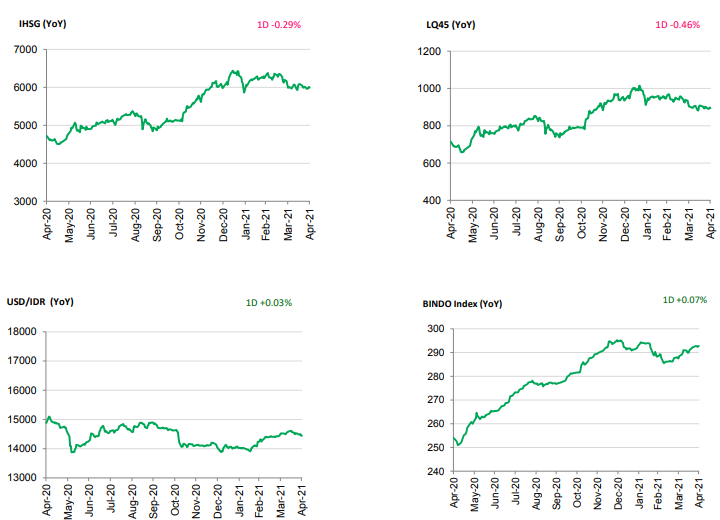 Bursa saham Amerika Serikat ditutup melemah di akhir pekan tertekan penurunan saham teknologi. Namun secara keseluruhan bursa saham Amerika Serikat membukukan penguatan di bulan Maret 2021 didukung oleh kebijakan moneter akomodatif dan stimulus fiskal yang besar. Akselerasi pemulihan ekonomi dan rilis kinerja yang kuat dari korporasi mendukung sentimen pasar dalam satu bulan terakhir. Bank besar seperti Goldman Sachs dan perusahaan teknologi seperti Facebook dan Alphabet mengeluarkan rilis kinerja kuartal satu yang melampaui estimasi Wall Street. Di antara perusahaan S&P 500 yang telah melaporkan kinerja, sekitar 84% berhasil mencapai atau melebihi estimasi penjualan. Zona Eropa merosot ke dalam resesi double dip pada kuartal pertama dimana PDB Q1-21 mencatatkan kontraksi 0,6% menyusul -0,7% pada kuartal sebelumnya, dikarenakan oleh vaksinasi yang lambat dan lockdown yang diberlakukan di beberapa negara. Imbal hasil UST 10 tahun turun ke level 1,62%.