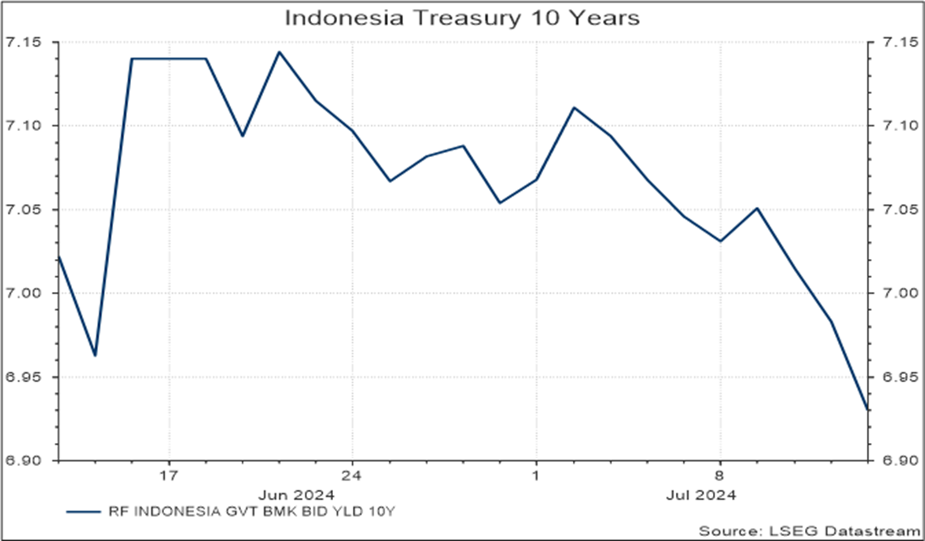Pasar global terus memperhatikan data dari AS, dan deflasi bulanan yang tidak terduga ini membawa sentimen positif bagi aset berisiko. Ini adalah deflasi bulanan pertama sejak Mei 2020, terutama karena penurunan harga energi (-2%), khususnya bensin yang turun 3,8%. Akibatnya, pasar sekarang memperkirakan kemungkinan besar penurunan suku bunga paling cepat pada bulan September. Imbal hasil obligasi pemerintah AS 10 tahun turun menjadi 4,2% dari puncaknya di 4,7% pada bulan April karena ekspektasi penurunan suku bunga.