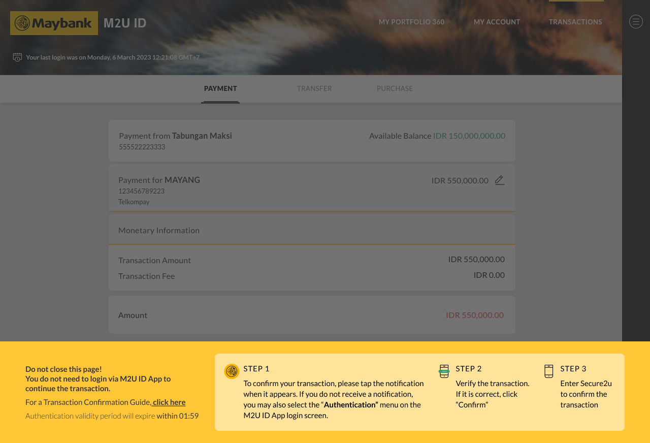 After entering the M2U ID Web dashboard, click the "Transaction" button at the top right.