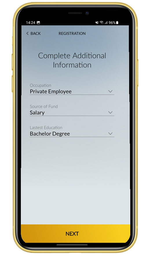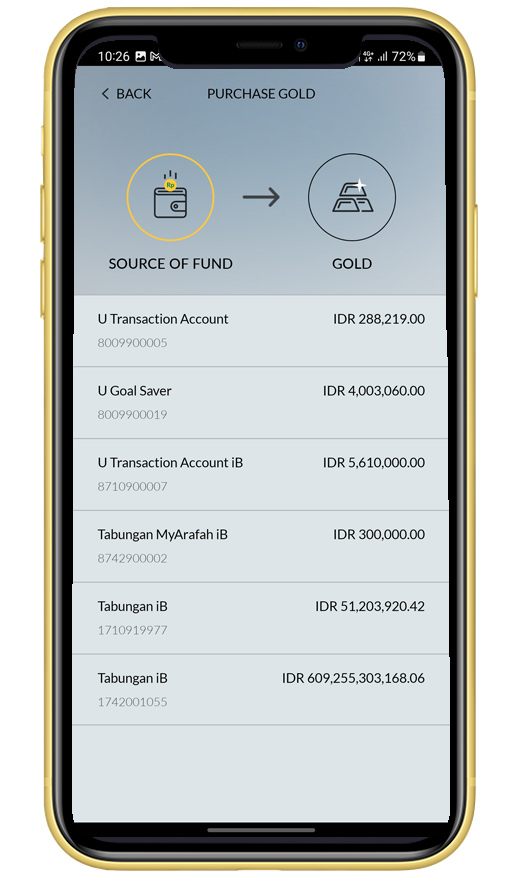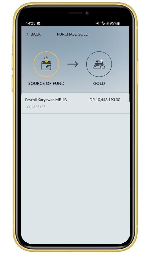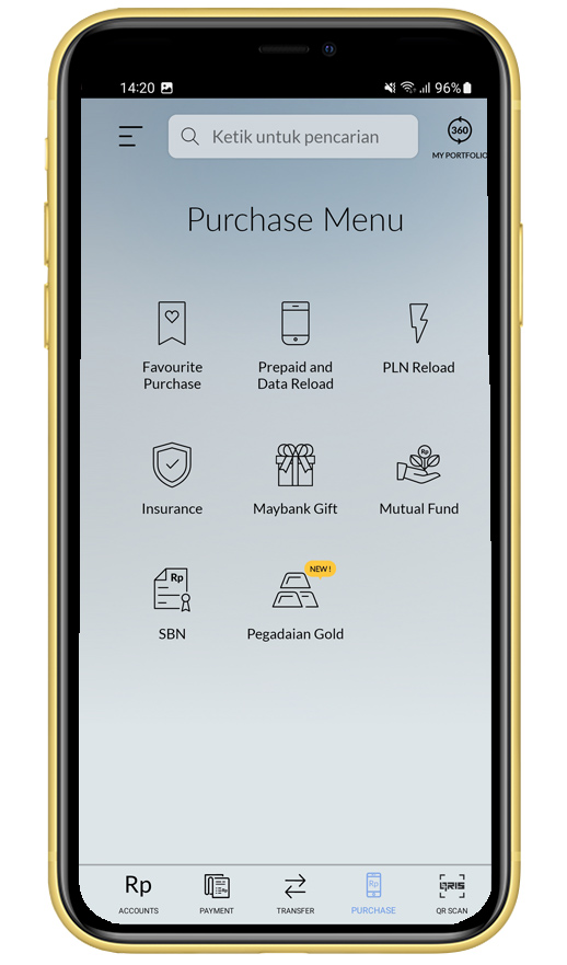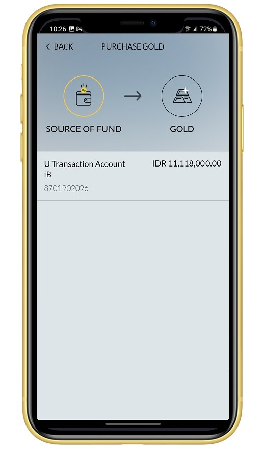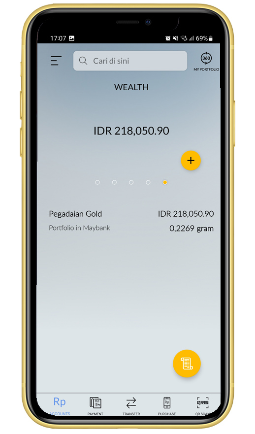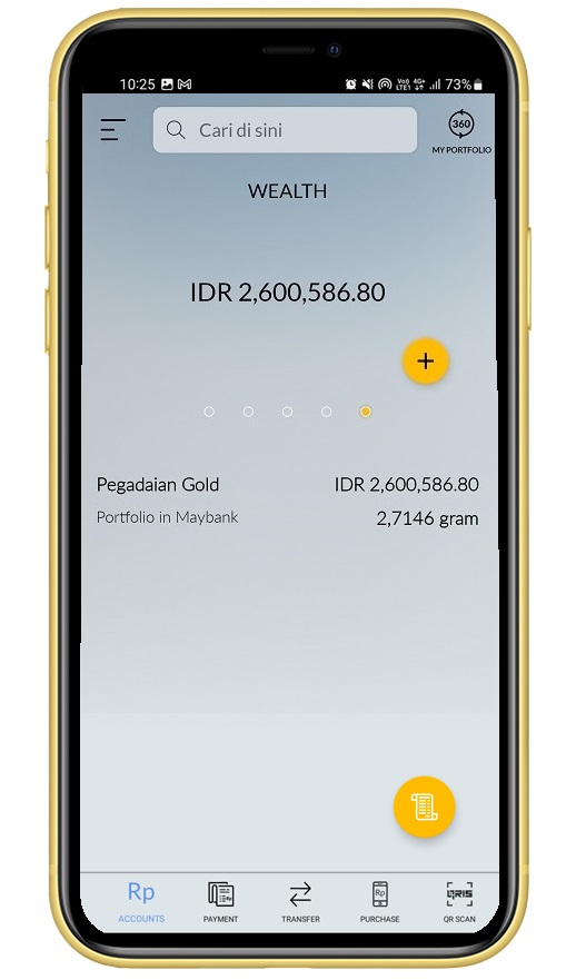 Swipe to the wealth menu on the home page, then click “+”button or click your Gold portfolio Gold Purchase can also be accessed by clicking Purchase menu on account dashboard.