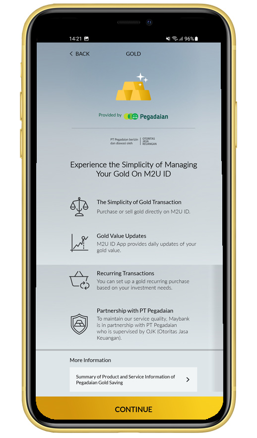 Pegadaian Gold Savings via the M2U ID App is a digital gold investment service from Maybank Indonesia in collaboration with PT Pegadaian. Through this service, customers can start saving gold from as little as IDR 10,000 easily and securely.