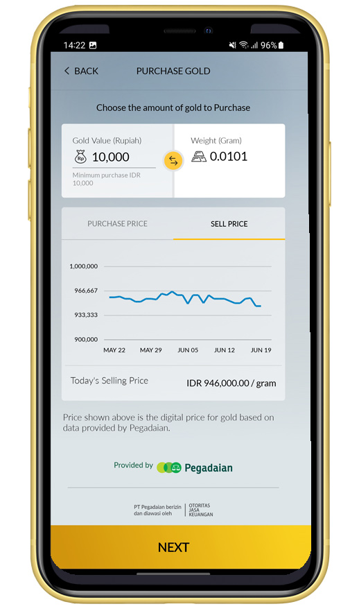 Input the amount of gold you want to purchase in grams or the nominal amount (in IDR). Then click “Next” |