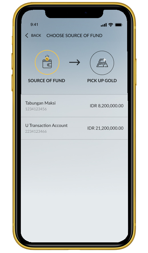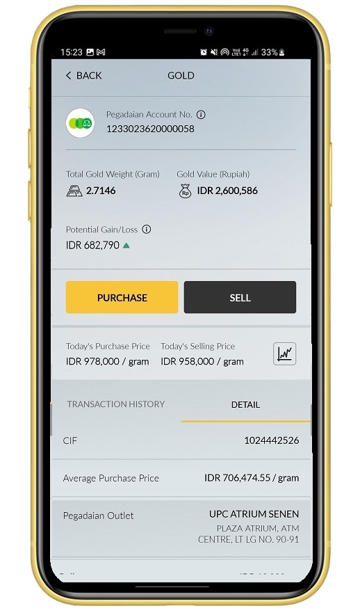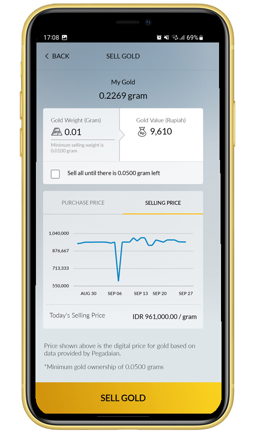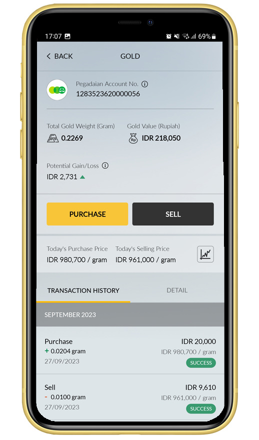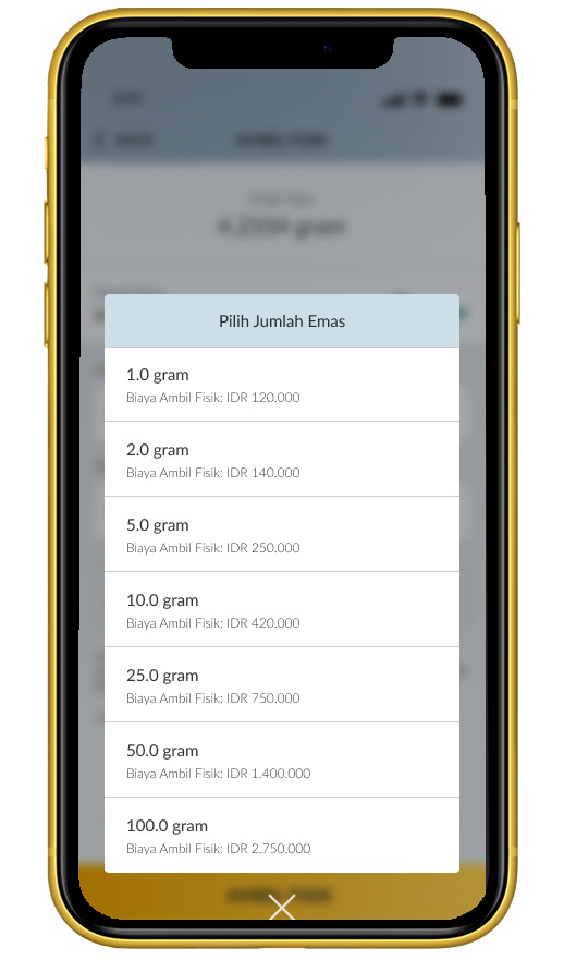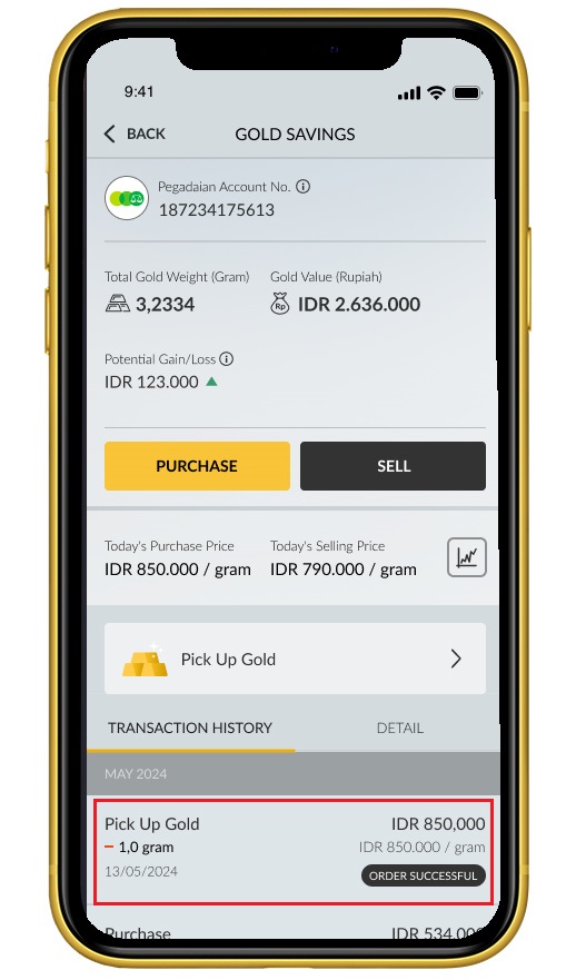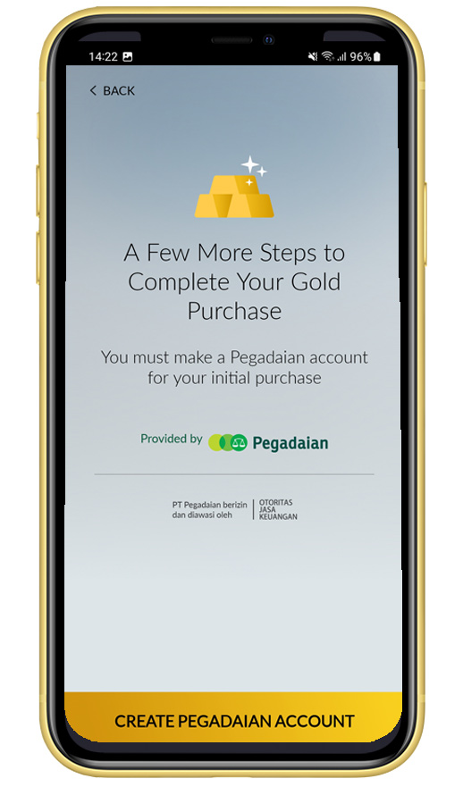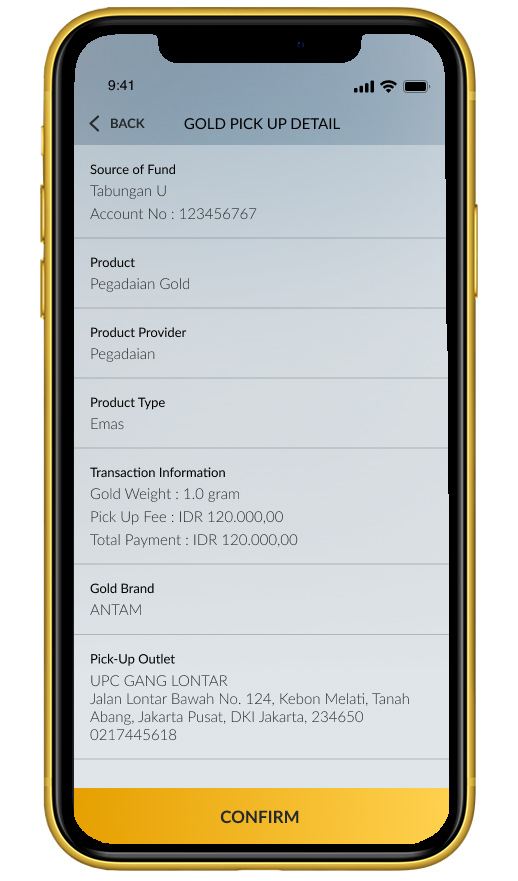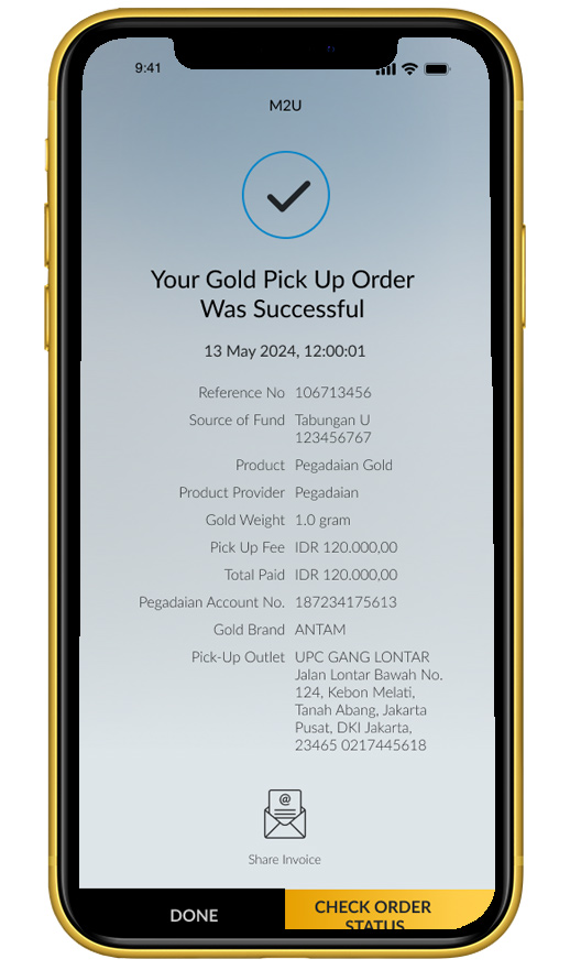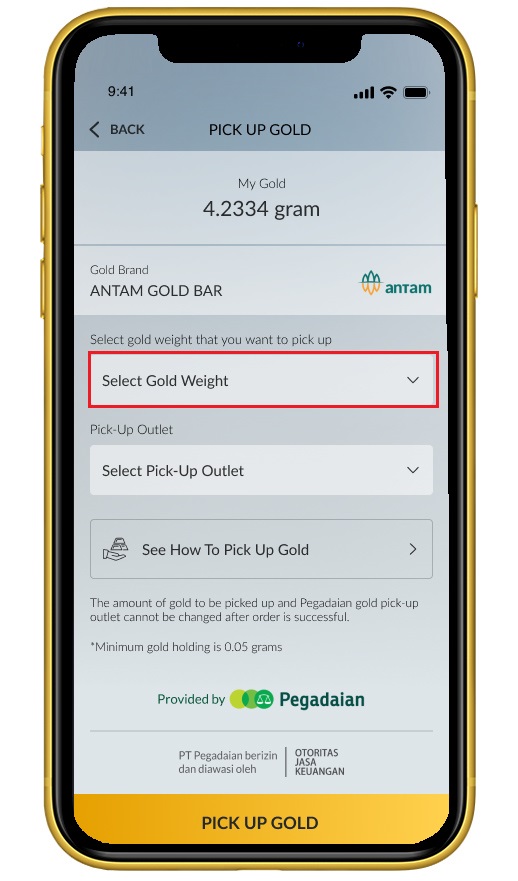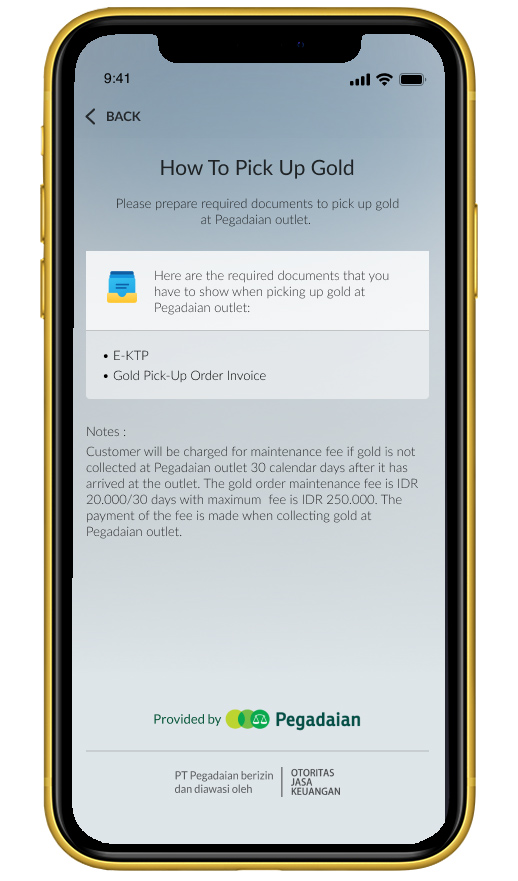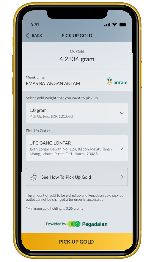 Pick up your Gold at the Pegadaian outlet by presenting your e-KTP and order receipt. |