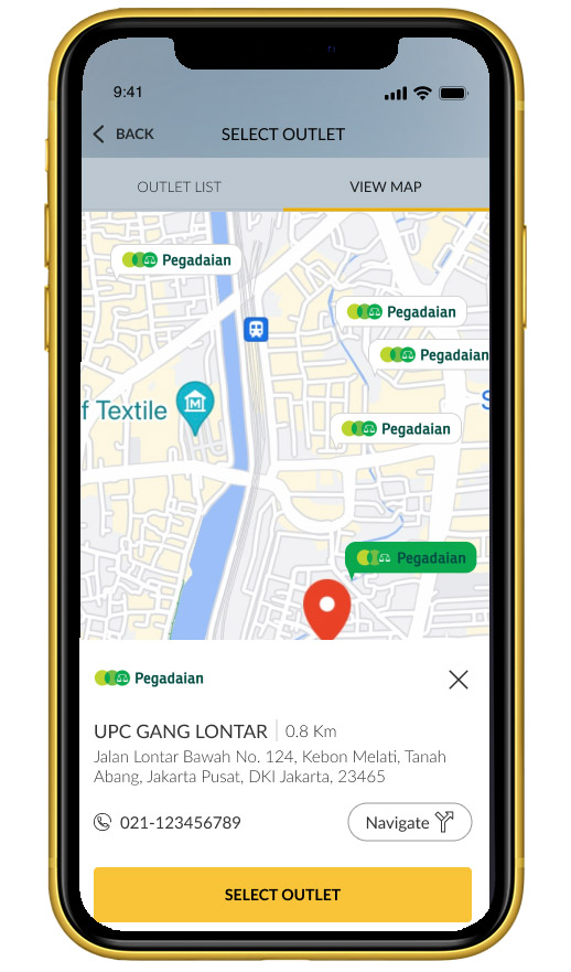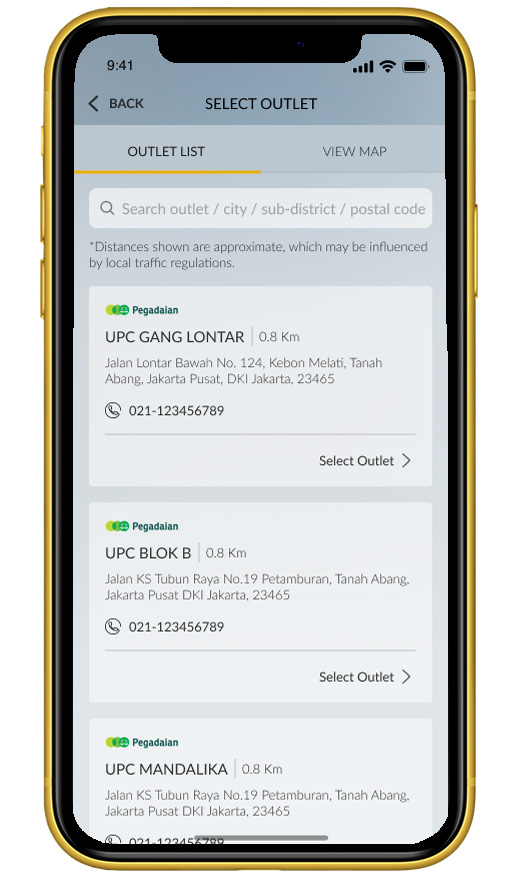 Select a Pegadaian outlet to collect your gold through the "Outlet List" or "View Map" tab. Use the search field on the "Outlet List" tab to easily choose the Pegadaian outlet you wish to visit.