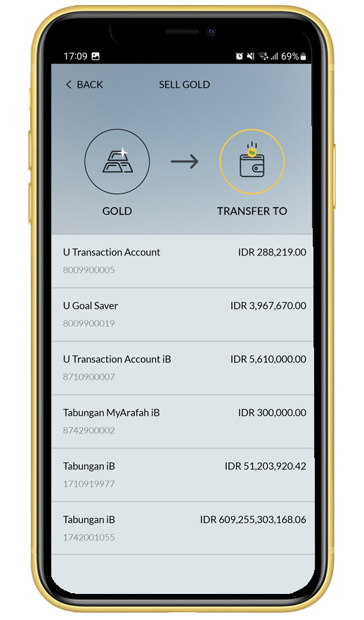 On the account dashboard, swipe to the "Investment & Insurance" menu, then click on your gold portfolio. |