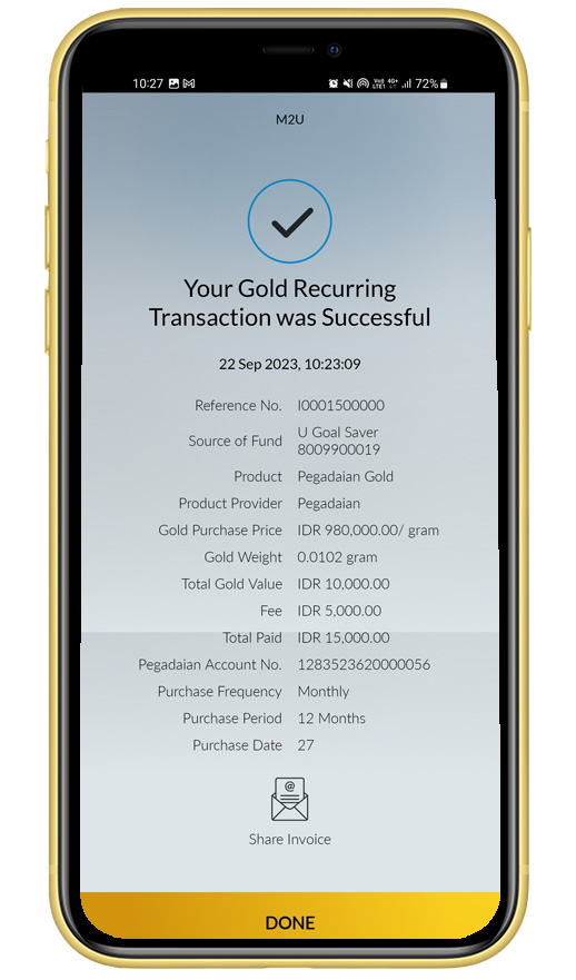 Your Gold recurring transaction was successfully created After successful transaction, Customer will receive push and email notification.