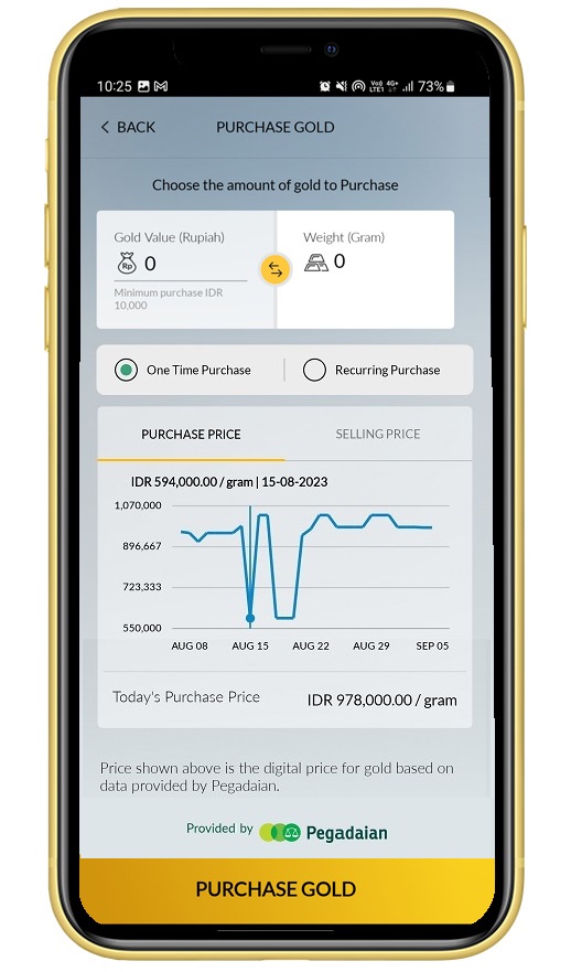 Choose One time purchase. Input the amount of gold (in IDR/grams) you wish to purchase, then click “Purchase Gold” |