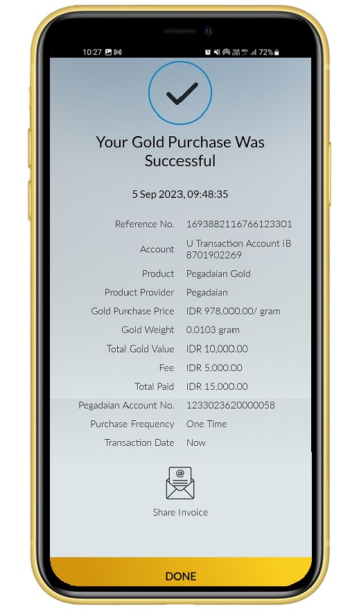Gold purchase transaction was successful. After successful transaction, customer will receive push and email notification.