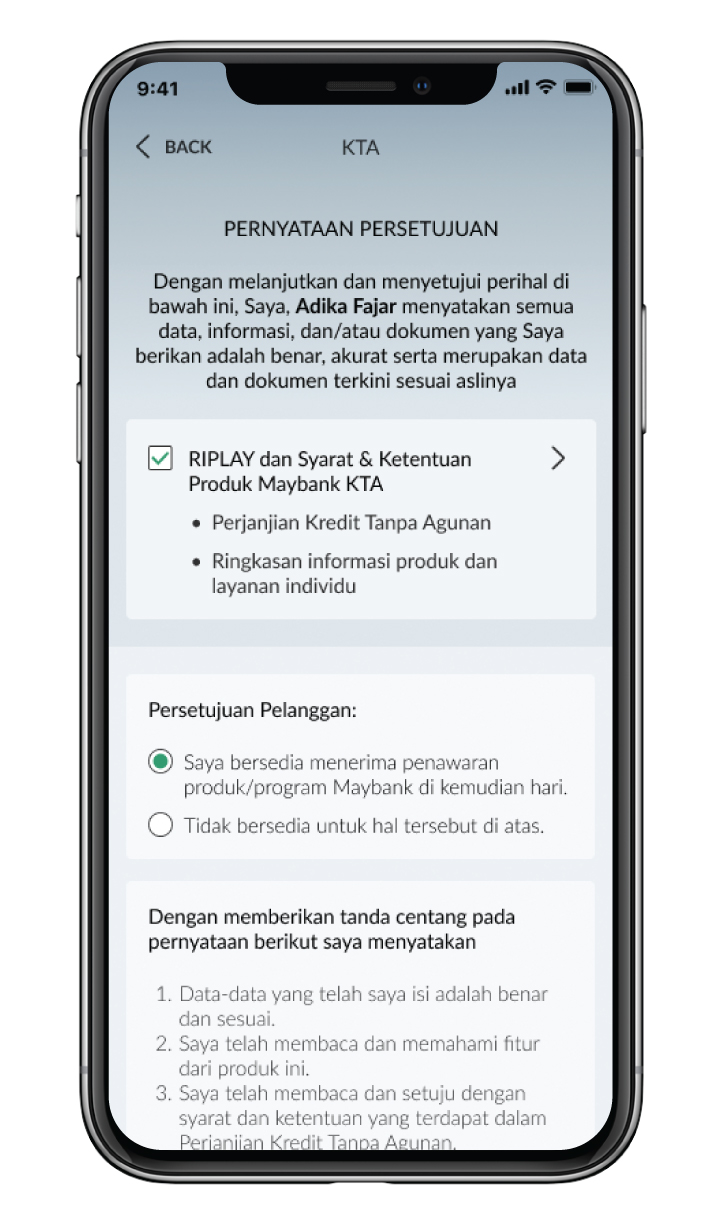 Klik checkbox untuk menyetujui perjanjian pengajuan Maybank KTA