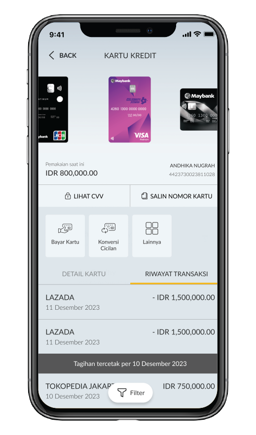 Pada dasbor rekening, geser kiri ke dasbor kartu kredit, lalu pilih kartu kredit yang Kamu ingin salin nomornya |