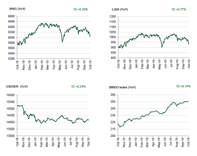 Consumer Confidence Index (September 2019) turun ke level 121,8 dari bulan sebelumnya 123,1. IHSG rebound 0,38% sementara BINDO naik 0,18%. Investor asing di pasar saham membukukan pembelian bersih senilai Rp475,03 miliar. Imbal hasil obligasi pemerintah tenor 10 tahun turun ke level 7,23%.