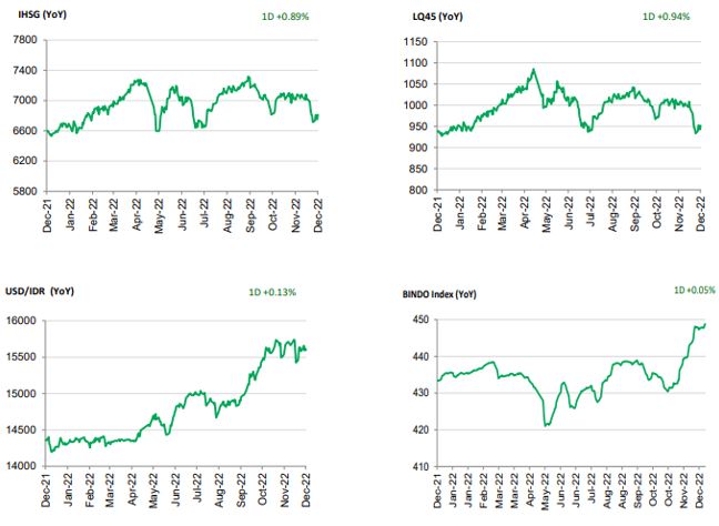Pasar saham Amerika Serikat kembali mencatat pelemahan dibayangi kekhawatiran resesi setelah komentar The Fed yang mengindikasikan dapat menahan suku bunga pada level tinggi lebih lama. Presiden Fed New York John Williams mengatakan walau inflasi sudah mulai turun, sektor tenaga kerja yang ketat masih menekan inflasi dan membutuhkan suku bunga bertahan di level tinggi. Indeks S&P 500 melemah 1,11% dengan sektor real estate dan consumer discretionary mencatat pelemahan terdalam. Imbal hasil UST 10 tahun naik dari 3,44% ke 3,48%. Data yang dirilis adalah PMI manufaktur Amerika Serikat (Desember) turun dari 47,7 menjadi 46,2, dan PMI jasa turun dari 46,2 menjadi 44,4.