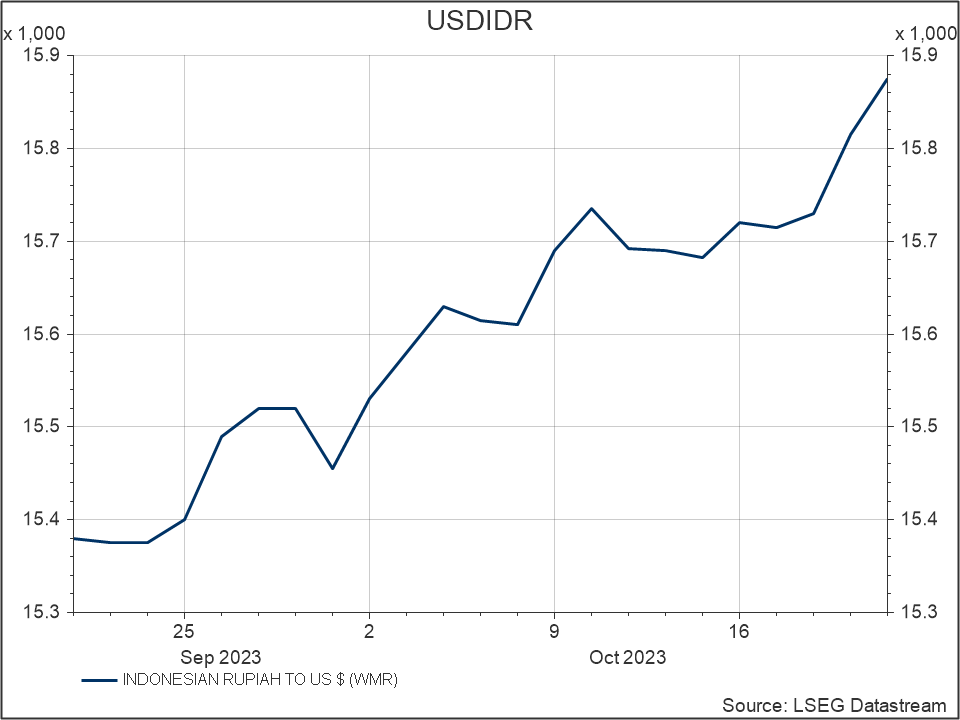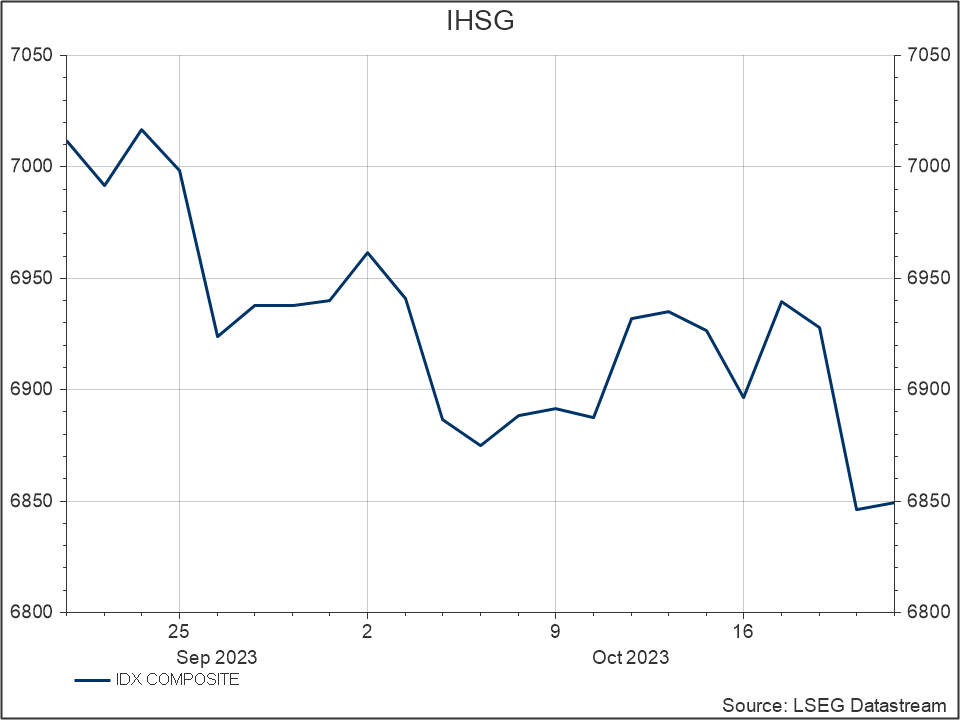 Perekonomian Amerika Serikat terus menunjukkan ketahanan yang mengejutkan dan mendorong The Fed untuk menaikkan suku bunga lebih tinggi dalam jangka waktu yang lebih lama. Meskipun demikian, pasar cukup yakin bahwa pertemuan FOMC mendatang pada tanggal 1 November akan melihat suku bunga tetap stabil setelah pidato Ketua Fed baru-baru ini. Meskipun pasar masih melihat kemungkinan yang lebih tinggi bagi suku bunga Amerika Serikat untuk mencapai puncaknya dan mulai turun pada pertengahan tahun 2024, Ketua Fed mengingatkan bahwa kemungkinan pengetatan lebih lanjut tetap terbuka jika pertumbuhan ekonomi tetap kuat. Data yang dirilis baru-baru ini menunjukkan ketahanan perekonomian dan menambah tantangan bagi rencana The Fed untuk melakukan pelonggaran moneter. Klaim pengangguran menunjukkan lintasan penurunan pengangguran secara keseluruhan sejak bulan Agustus dengan angka yang lebih rendah dari perkiraan, seiring dengan data produksi industri YoY yang menunjukkan pertumbuhan dibandingkan kontraksi yang diperkirakan.