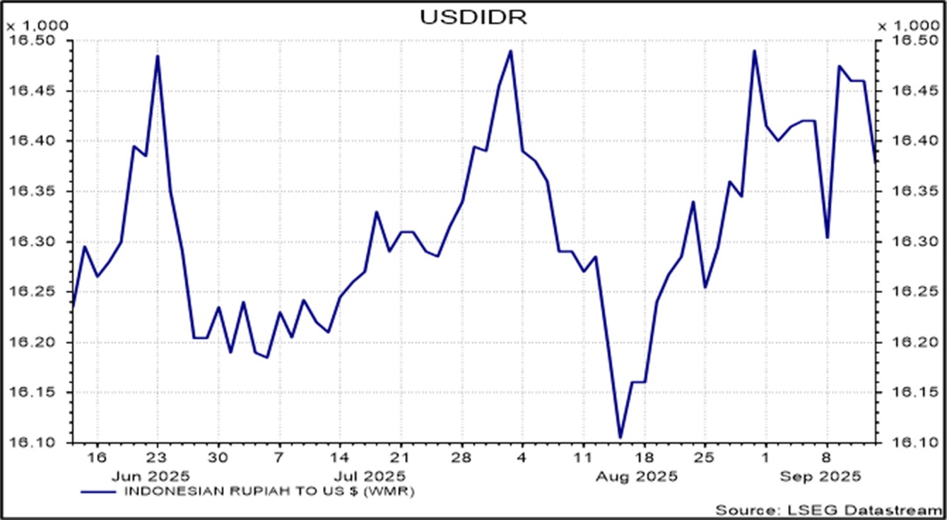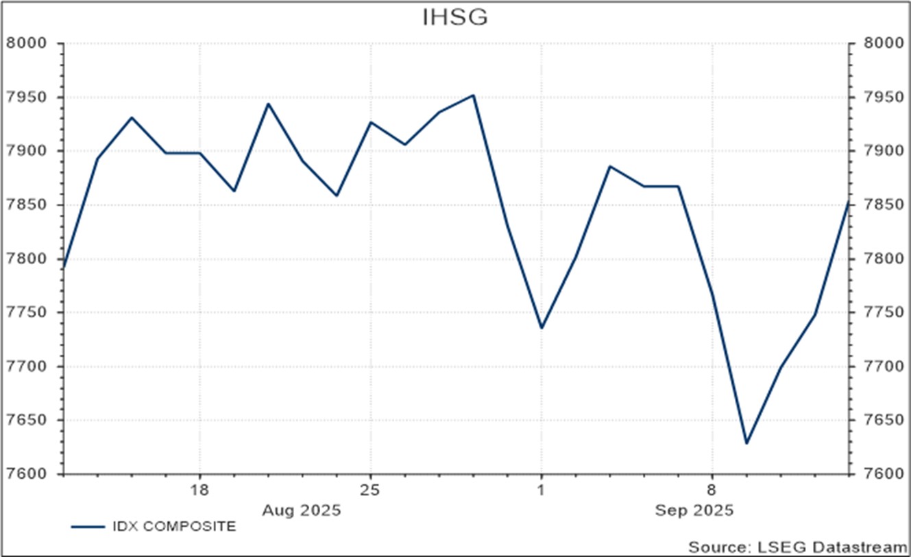 Bank Indonesia (BI) kembali membuat kejutan dengan memangkas suku bunga, melanjutkan kejutan serupa bulan sebelumnya. Selain memangkas suku bunga acuan sebesar 25 bps, BI juga memangkas suku bunga simpanan bank harian (overnight deposit rate) lebih agresif sebesar 50 bps menjadi 3,75%. Langkah ini mendorong bank untuk tidak menyimpan dana berlebih, melainkan menyalurkannya dalam bentuk kredit. Kebijakan BI sejalan dengan langkah Menteri Keuangan Purbaya yang sebelumnya menambah Rp200 triliun likuiditas ke perbankan BUMN, guna mempercepat pertumbuhan ekonomi melalui efek pengganda. Ke depan, BI masih membuka ruang pemangkasan tambahan sebesar 50 bps hingga akhir tahun dan 25 bps lagi pada kuartal pertama tahun depan. Secara keseluruhan, kondisi makro Indonesia tetap stabil, baik dari sisi inflasi maupun nilai tukar Rupiah yang bertahan di kisaran Rp16.200,- hingga Rp16.500,- per dolar AS, meski sudah lebih dulu memangkas suku bunga dibanding The Fed.