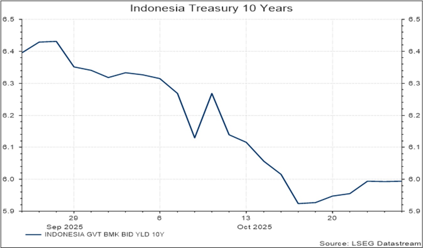 Pasar obligasi AS menunjukkan ekspektasi terhadap pelonggaran moneter yang lebih agresif, dengan kemungkinan dua kali pemangkasan suku bunga The Fed hingga akhir tahun (total 50 bps). Investor memperkirakan laju penurunan suku bunga berlanjut hingga mencapai titik terendah pada kuartal pertama 2027. Lingkungan suku bunga yang menurun ini tetap menjadi katalis positif bagi pasar obligasi global dan mendukung rotasi aliran dana dari aset AS ke pasar negara berkembang.