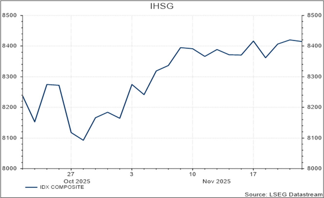 Data ketenagakerjaan AS minggu ini menunjukkan sinyal yang bercampur. Tingkat pengangguran naik ke level tertinggi sejak Oktober 2021, mencapai 4,3% dan meleset dari ekspektasi pasar. Namun, Non-Farm Payrolls justru mencatat pertumbuhan terkuat dalam lima bulan terakhir dan melampaui konsensus, menandakan ketahanan pasar tenaga kerja. Dari sisi pasar keuangan, volatilitas masih tinggi meskipun laporan laba NVIDIA yang lebih baik dari ekspektasi sempat mendorong kenaikan indeks saham AS. Kekhawatiran atas valuasi saham-saham bertema AI tetap membebani sentimen. Di sisi kebijakan, data tenaga kerja yang beragam turut menekan ekspektasi pemangkasan suku bunga The Fed pada pertemuan Desember. Probabilitas pemangkasan kini turun ke sekitar 30%, dan proyeksi Fed Funds Rate akhir tahun bergerak naik dari 3,6% menjadi 3,8%. Meskipun demikian, pasar tetap melihat bahwa tren penurunan suku bunga dalam jangka menengah masih solid, tercermin dari turunnya yield UST 10Y ke 4,05% dan yield 2Y ke 3,5%.