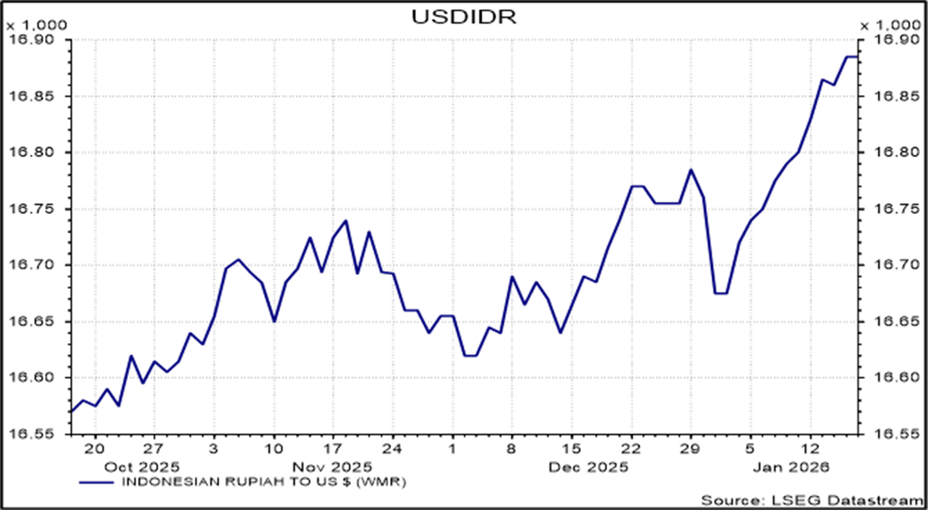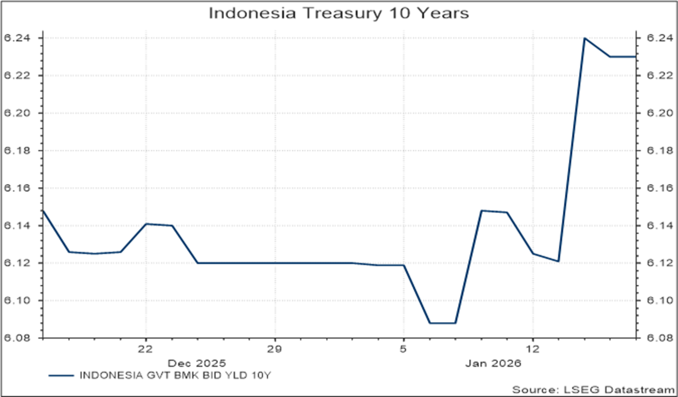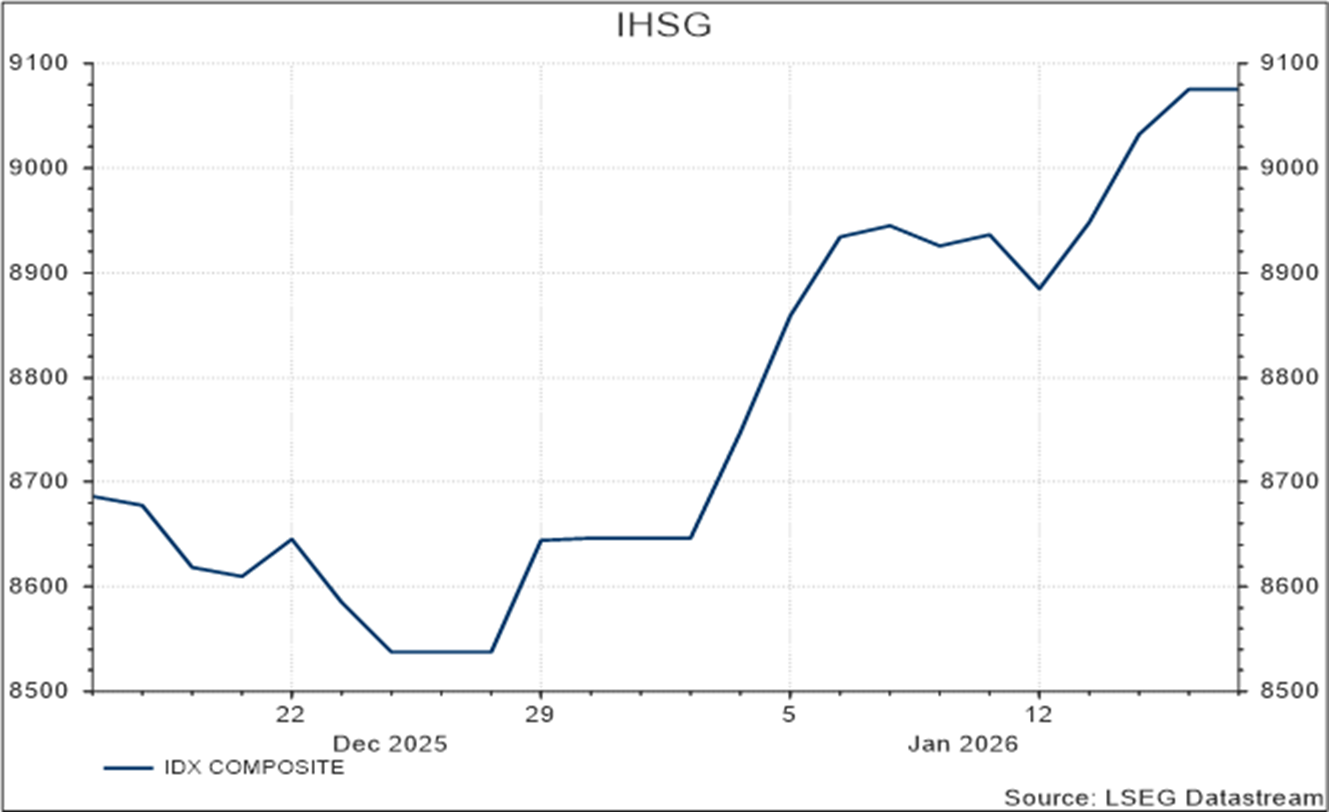 Pasar global pada minggu ini masih sangat sensitif terhadap perkembangan berita utama. Data inflasi konsumen AS yang dirilis relatif sesuai dengan ekspektasi pasar dan tidak mengubah pandangan bahwa The Fed kemungkinan akan menahan suku bunga pada pertemuan mendatang. Namun demikian, kekhawatiran terkait independensi The Fed kembali mencuat, bersamaan dengan meningkatnya ketegangan geopolitik yang melibatkan AS. Secara umum, kondisi makroekonomi masih mendukung narasi pelonggaran kebijakan global, meskipun pasar menilai jalur menuju suku bunga terminal tetap rentan dan berpotensi memicu volatilitas.