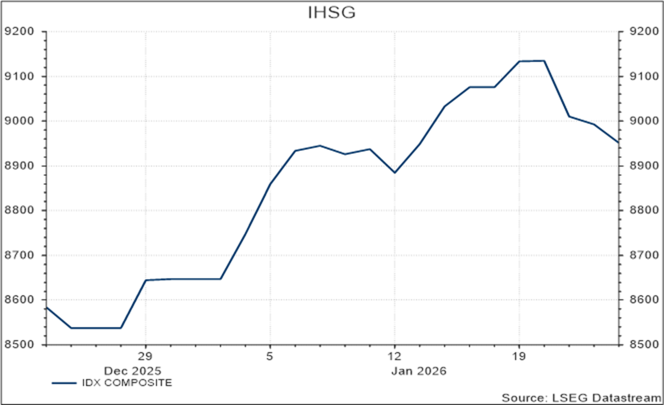 Pergerakan utama pasar global minggu ini dipengaruhi oleh perkembangan geopolitik, khususnya terkait isu Greenland dan Iran. Volatilitas pasar meningkat seiring pernyataan Presiden AS mengenai potensi tambahan tarif serta pembentukan “Board of Peace” yang dibahas dalam forum Davos. Dampak langsung terlihat pada pergerakan harga komoditas seperti minyak mentah dan emas, di mana harga emas kembali mencetak rekor tertinggi. Pasar memperkirakan The Fed akan mempertahankan suku bunga pada pertemuan pekan depan, dengan ekspektasi satu kali penurunan suku bunga hingga Juli.