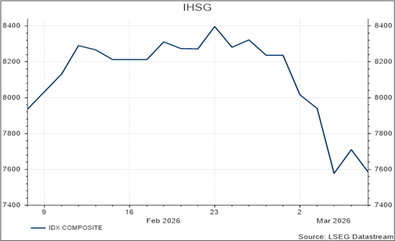 Di sisi geopolitik, perhatian global tertuju pada eskalasi konflik di Iran setelah dimulainya operasi militer yang disebut “Operation Epic Fury”, yang melibatkan serangan terkoordinasi oleh Amerika Serikat dan Israel terhadap berbagai target strategis di Iran. Konflik tersebut memicu balasan dari Iran terhadap wilayah Teluk yang bersekutu dengan AS serta beberapa pangkalan militer AS. Ketegangan ini menyebabkan lonjakan harga komoditas energi akibat kekhawatiran terhadap gangguan pasokan dan jalur perdagangan. Di pasar obligasi, imbal hasil US Treasury meningkat tajam seiring meningkatnya risiko inflasi, dengan yield tenor 10 tahun naik sekitar 22 bps ke 4,16% dan tenor 2 tahun naik ke 3,60%. Kekhawatiran terhadap inflasi juga meningkat karena lonjakan harga energi yang berdampak langsung pada harga bensin di AS, yang telah naik sekitar 59% sejak titik terendah awal Januari.