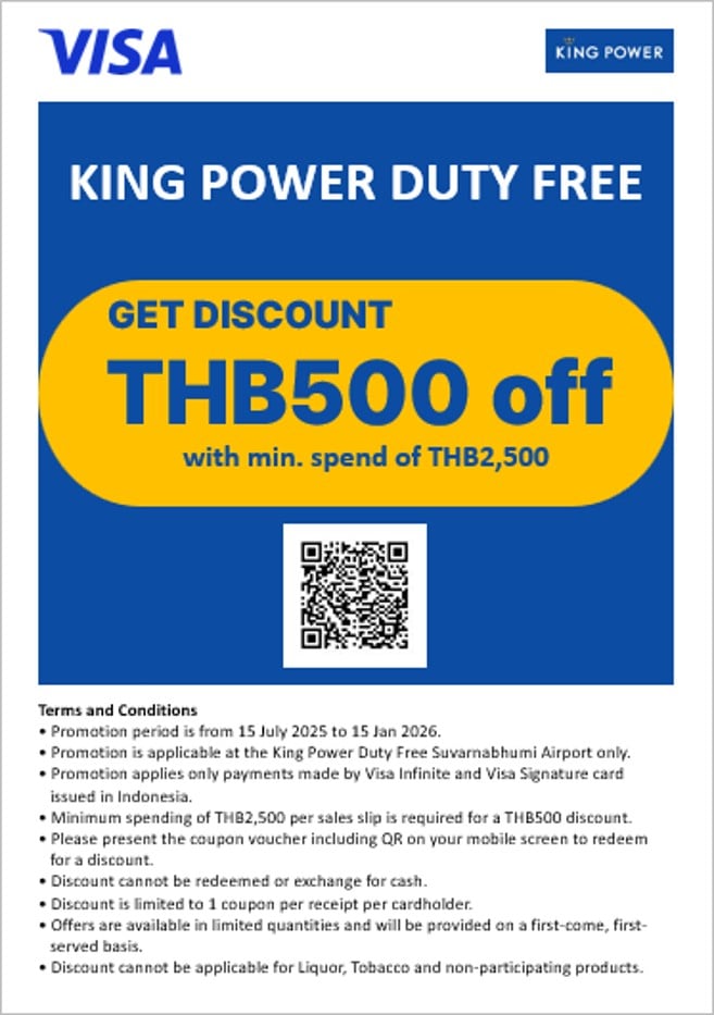 - Promo is valid at King Power Duty Free, Suvarnabhumi Airport, Thailand, by presenting the QR voucher available at CLICK HERE