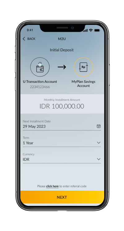 Regular monthly deposit for Maybank MyPlan/MyPlan iB Savings Account start from IDR100,000/USD500. Select the next debit date along with the tenor and currency type, then click "NEXT" |