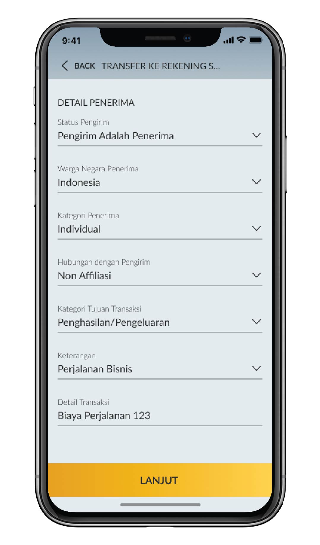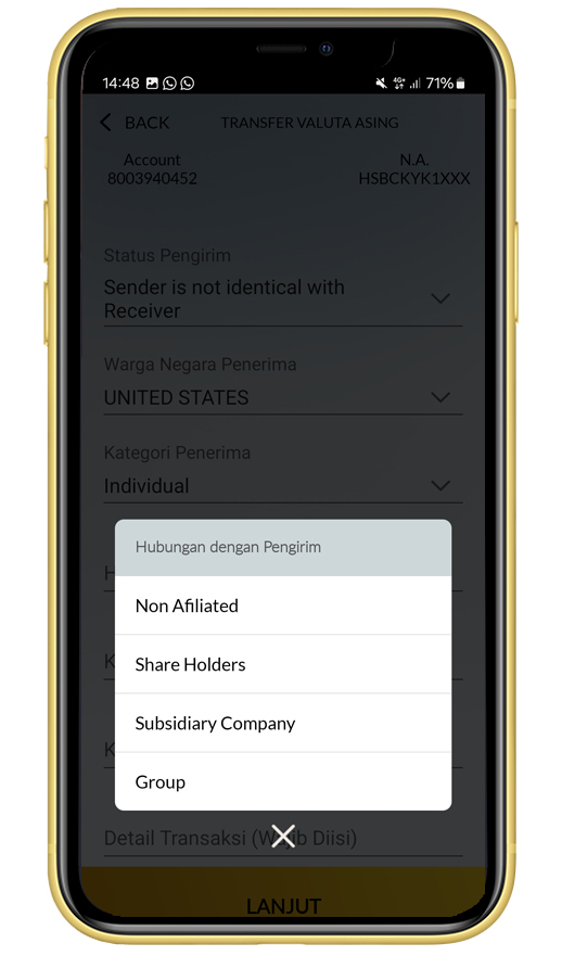 Input Your transaction purpose and underlying document type*. If Your foreign exchange transfer do not exceed USD100,000, choose “Without Underlying” An underlying document is required for IDR-CNY transfers in any amount, to any bank located or branched in Mainland China