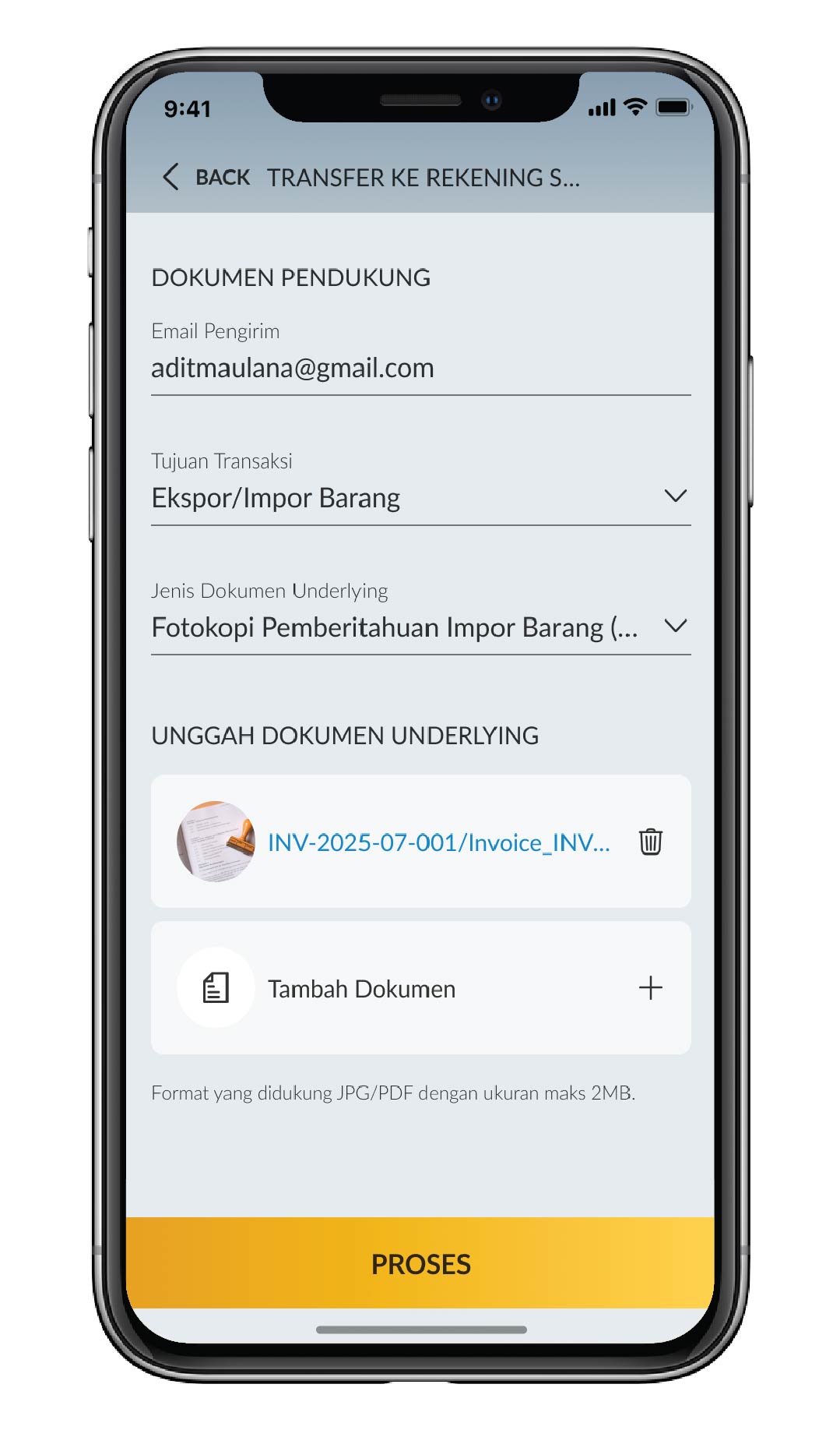 Transactions exceeding the equivalent of USD 100,000 require underlying documents. Please prepare the supporting documents, than tap ‘Next’ |
