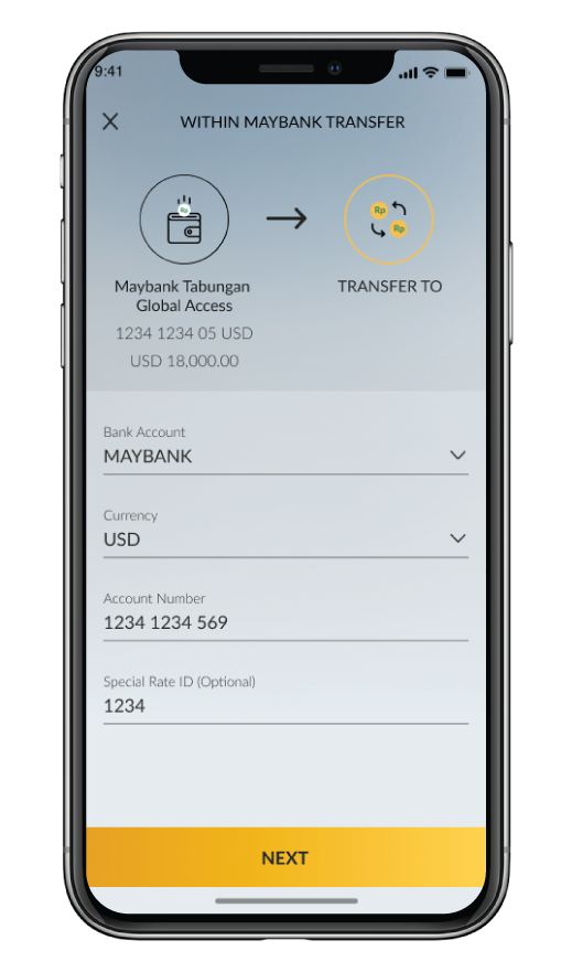 Select the destination currency, enter the recipient’s Maybank Account Number, enter the ‘Special Rate ID’ in the designated field, then click ‘Continue’ |