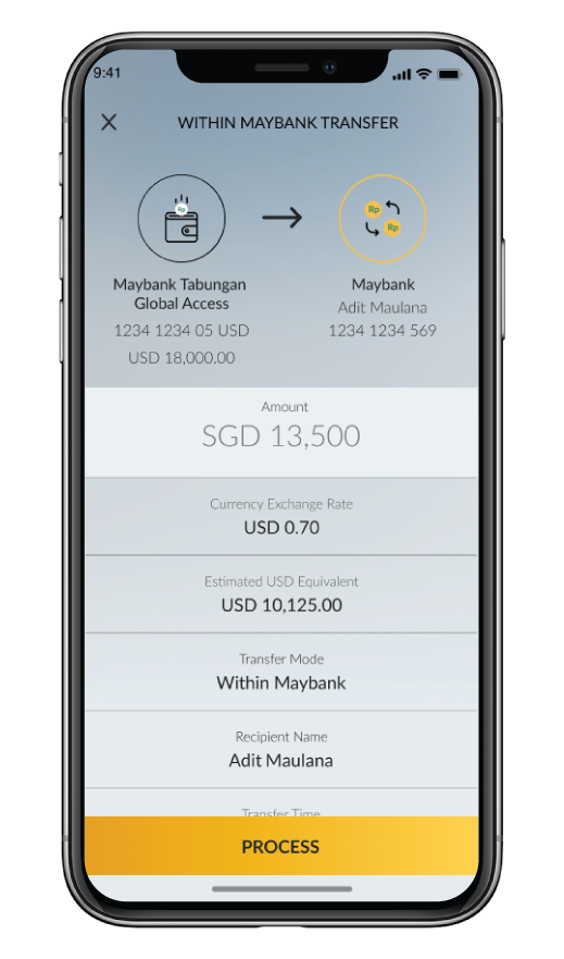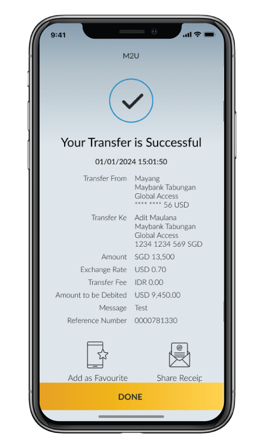 The foreign currency transfer between Maybank accounts with the Special Rate is successful. Click ‘Done’ to complete the transaction |