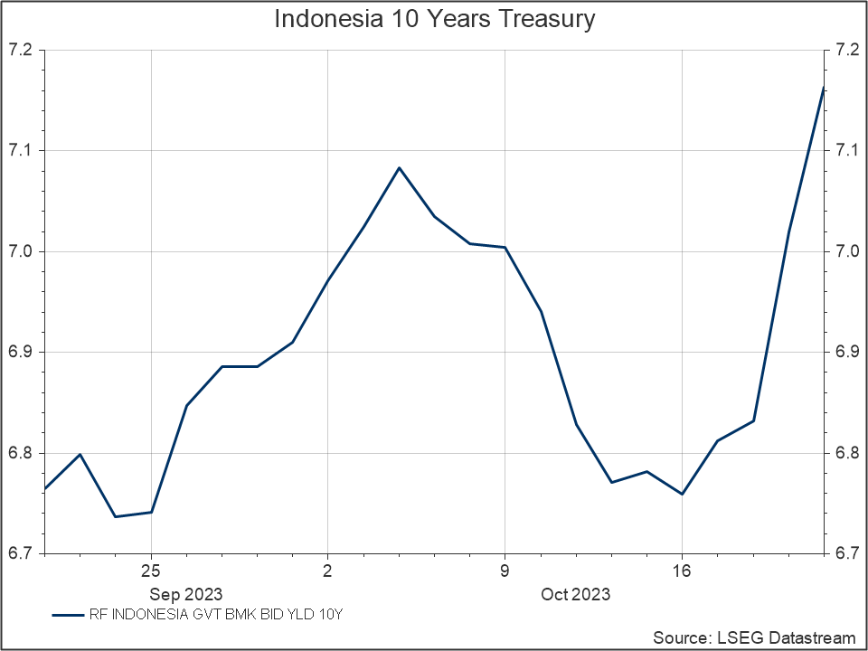 Perekonomian Amerika Serikat terus menunjukkan ketahanan yang mengejutkan dan mendorong The Fed untuk menaikkan suku bunga lebih tinggi dalam jangka waktu yang lebih lama. Meskipun demikian, pasar cukup yakin bahwa pertemuan FOMC mendatang pada tanggal 1 November akan melihat suku bunga tetap stabil setelah pidato Ketua Fed baru-baru ini. Meskipun pasar masih melihat kemungkinan yang lebih tinggi bagi suku bunga Amerika Serikat untuk mencapai puncaknya dan mulai turun pada pertengahan tahun 2024, Ketua Fed mengingatkan bahwa kemungkinan pengetatan lebih lanjut tetap terbuka jika pertumbuhan ekonomi tetap kuat. Data yang dirilis baru-baru ini menunjukkan ketahanan perekonomian dan menambah tantangan bagi rencana The Fed untuk melakukan pelonggaran moneter. Klaim pengangguran menunjukkan lintasan penurunan pengangguran secara keseluruhan sejak bulan Agustus dengan angka yang lebih rendah dari perkiraan, seiring dengan data produksi industri YoY yang menunjukkan pertumbuhan dibandingkan kontraksi yang diperkirakan.