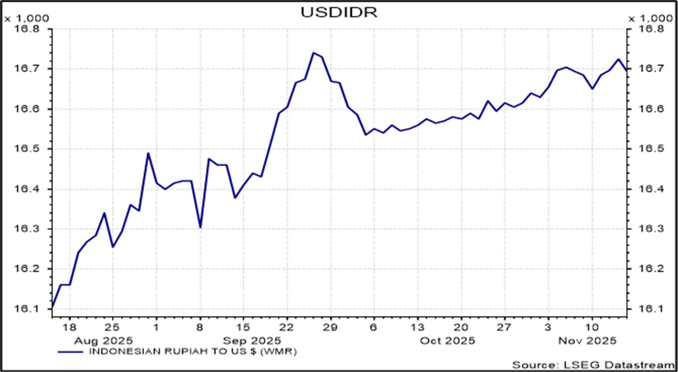 Indeks keyakinan konsumen naik ke level tertinggi sejak April, dengan peningkatan pada seluruh enam sub-indeks utama. Selain itu, penjualan ritel tumbuh di atas ekspektasi dan mencatat ekspansi selama lima bulan berturut-turut. Hal ini menandakan perbaikan momentum konsumsi domestik, yang menjadi pilar utama pertumbuhan Indonesia.
