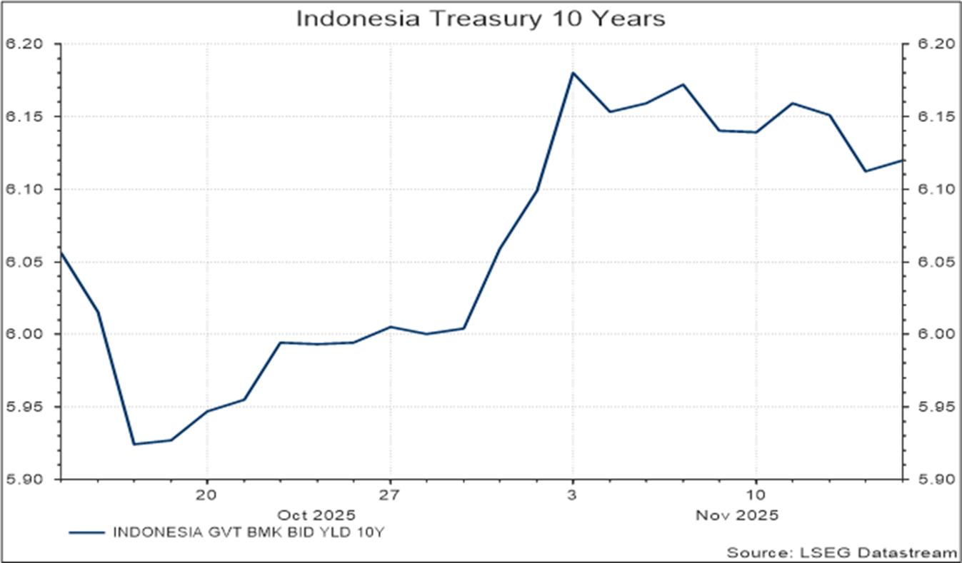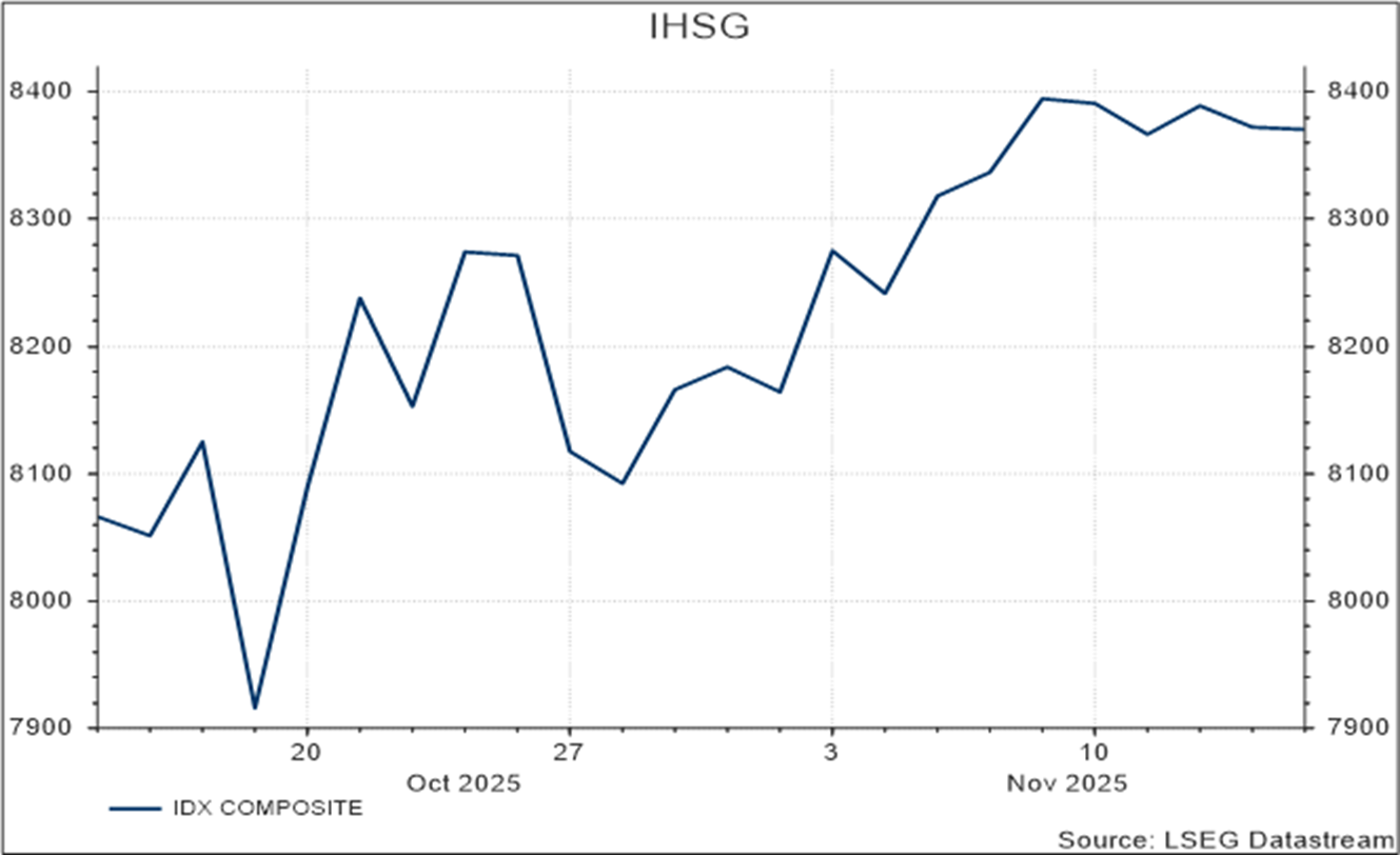 Di sisi domestik, Indeks saham Indonesia menunjukkan tanda-tanda titik balik setelah musim laporan keuangan 3Q25 yang menunjukkan penurunan laba lebih kecil dibanding kuartal sebelumnya. Pemulihan pada segmen konsumer tertentu dapat terlihat, dengan prospek 2026 yang membaik berkat dukungan kebijakan fiskal dan moneter yang tetap pro-pertumbuhan dan langkah terbaru untuk menambah likuiditas.