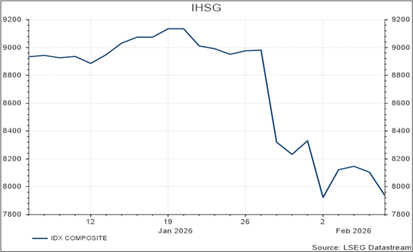Perekonomian Indonesia mencatat pertumbuhan kuartal IV yang lebih kuat dari perkiraan, didorong oleh konsumsi swasta yang didukung kebijakan pemerintah serta penurunan biaya pinjaman secara bertahap. Di pasar keuangan, otoritas terus mendorong reformasi menyeluruh pasar modal guna meningkatkan kredibilitas dan daya tarik investasi. Sejumlah inisiatif yang dibahas mencakup kenaikan batas minimum free float IPO menjadi 15%, peningkatan free float emiten eksisting, transparansi pemegang saham di atas 1%, serta klasifikasi investor yang lebih rinci. Namun, sentimen pasar sempat tertekan oleh keputusan Moody’s yang menurunkan outlook peringkat kredit Indonesia dari stabil menjadi negatif, meski peringkat tetap berada pada kategori Investment Grade. Keputusan ini berdampak langsung pada pasar, dengan indeks saham terkoreksi, imbal hasil SBN tenor 10 tahun naik, dan nilai tukar rupiah melemah. Ke depan, volatilitas diperkirakan masih berlanjut seiring sensitivitas pasar terhadap isu reformasi dan kondisi makro, sehingga strategi defensif dengan fokus pada instrumen berkualitas tinggi dan saham berfundamental kuat tetap menjadi pendekatan yang disarankan.
