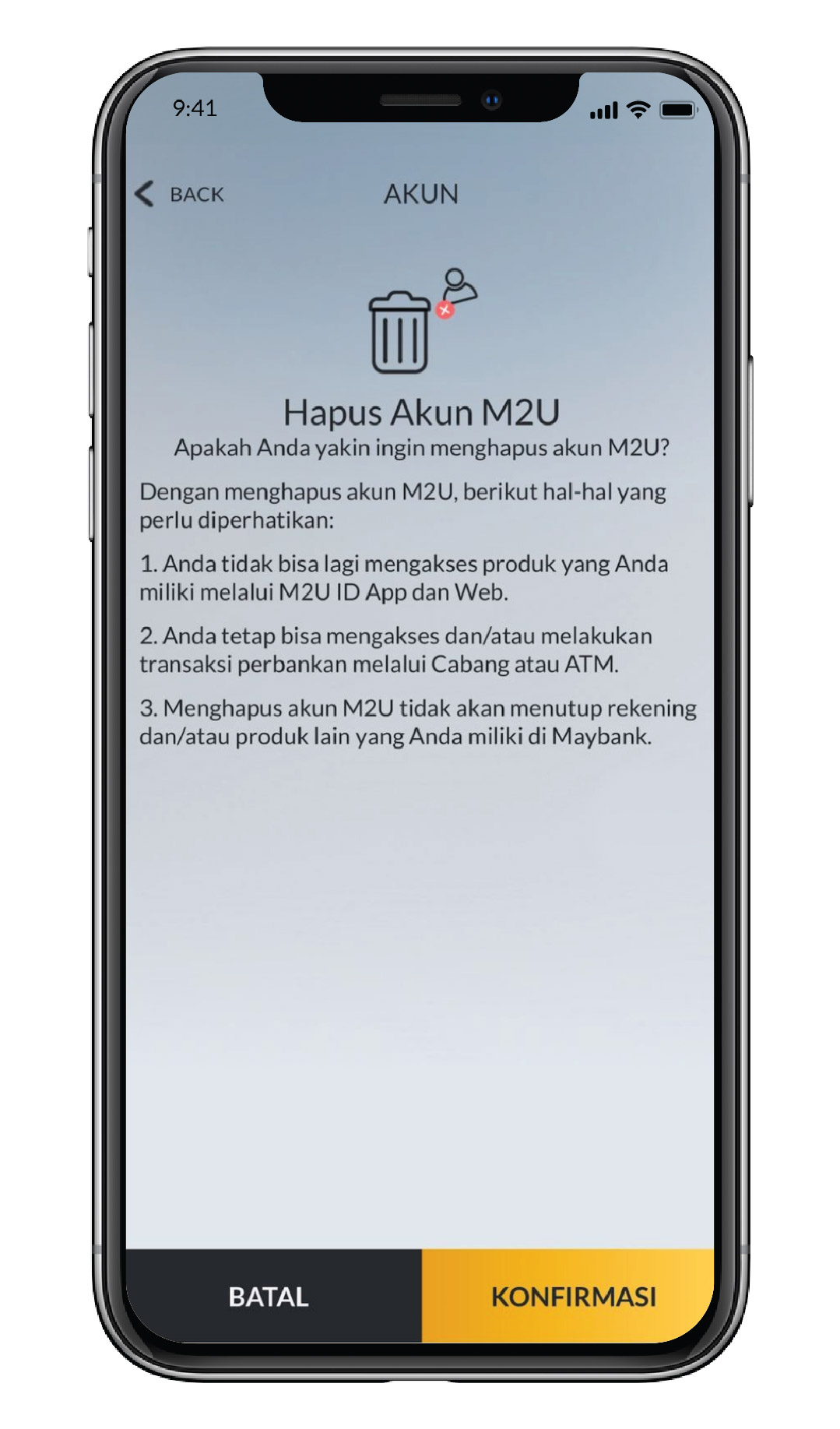 Baca informasi yang ditampilkan pada halaman konfirmasi. Pilih Konfirmasi bila yakin untuk melanjutkan proses penghapusan akun M2U ID |