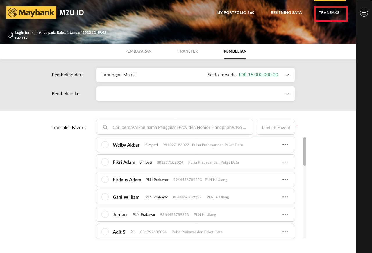 Setelahlogin akun di halaman M2U ID Web, Anda bisa klik ‘Transaksi’ yang berada di kanan atas. Setelah itu pilih tujuan transaksi dari list favorit Anda.