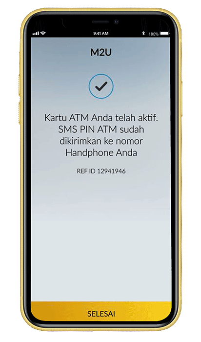Kartu Debit akan langsung di kirimkan ke alamat korespodensi. Segera lakukan aktivasi melalui M2U ID App jika Kartu Debit sudah diterima. |