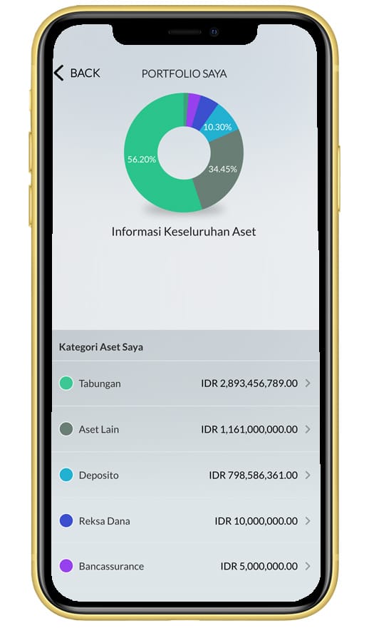 Tampilan Aset Saya. Pilih salah satu kategori aset yang Anda miliki seperti Tabungan, Deposito, Reksa Dana, dan Bancassurance untuk lihat rinciannya |