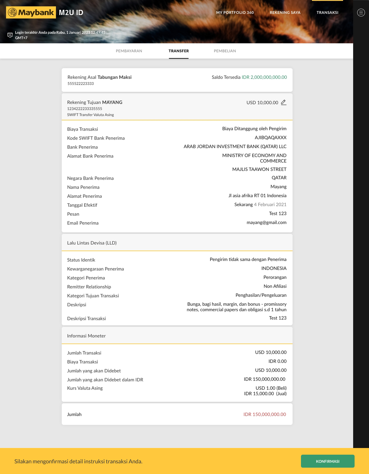 Cek kembali detail transaksi pada M2U ID App, lalu klik ‘Konfirmasi’ jika sudah sesuai.