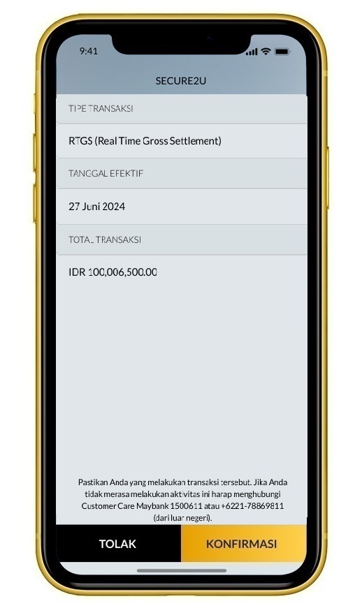 Cek kembali detail transaksi pada M2U ID App, lalu klik ‘Konfirmasi’ jika sudah sesuai.