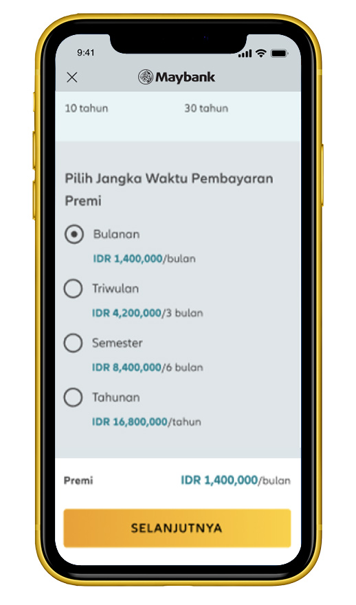 Pilih jangka waktu pembayaran premi, lalu klik ‘Selanjutnya’. |