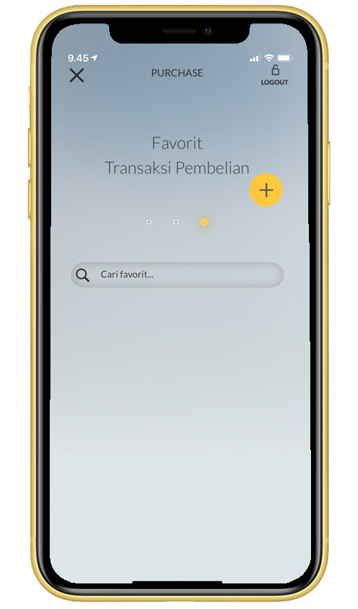 Geser ke kiri. Pada layar Favorit Transaksi Pembelian, klik tombol kuning (+)