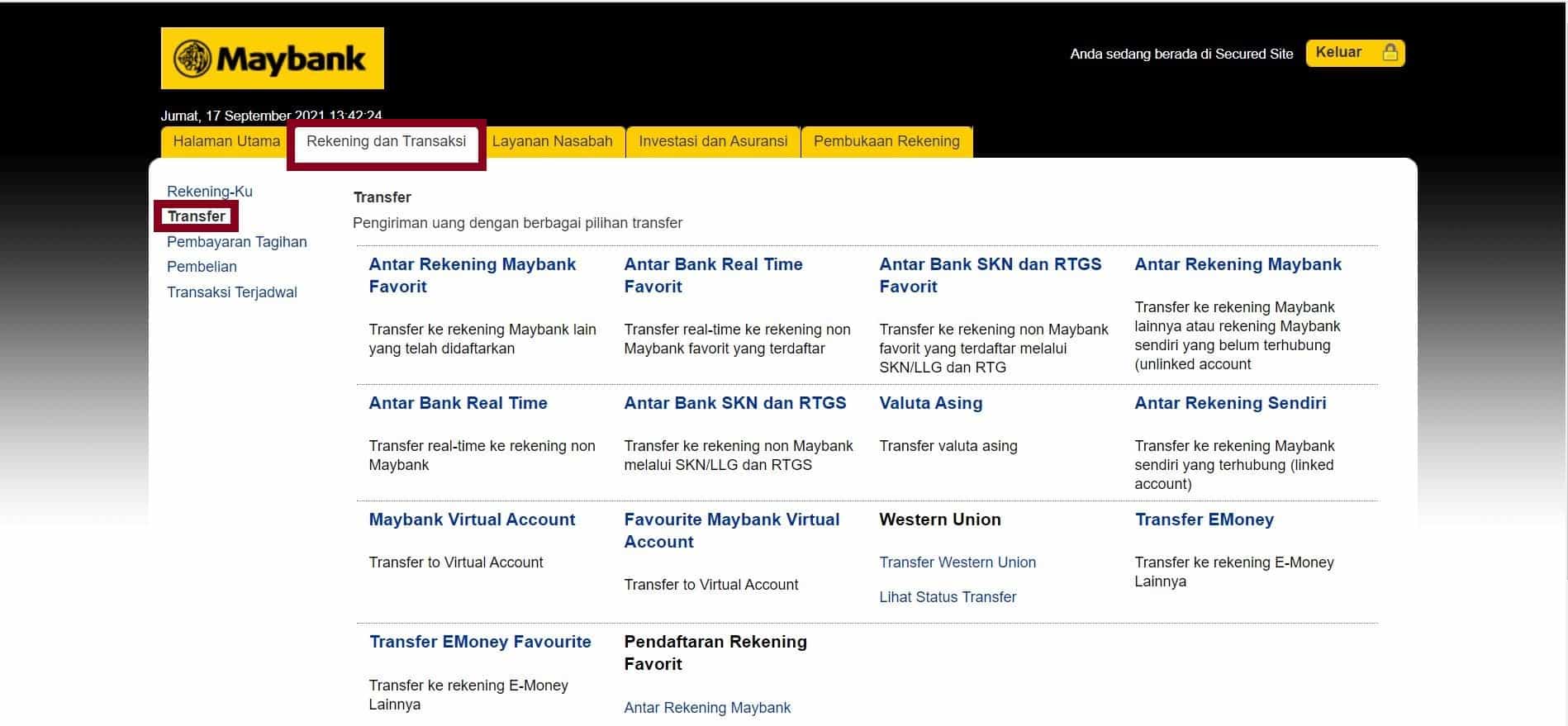Klik Menu Rekening dan Transaksi, pada pilihan menu di kiri klik “Transfer”