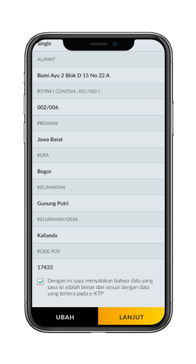 Lengkapi seluruh data diri dan pastikan seluruh data sudah benar. Klik kotak untuk konfirmasi dan klik “Lanjut”