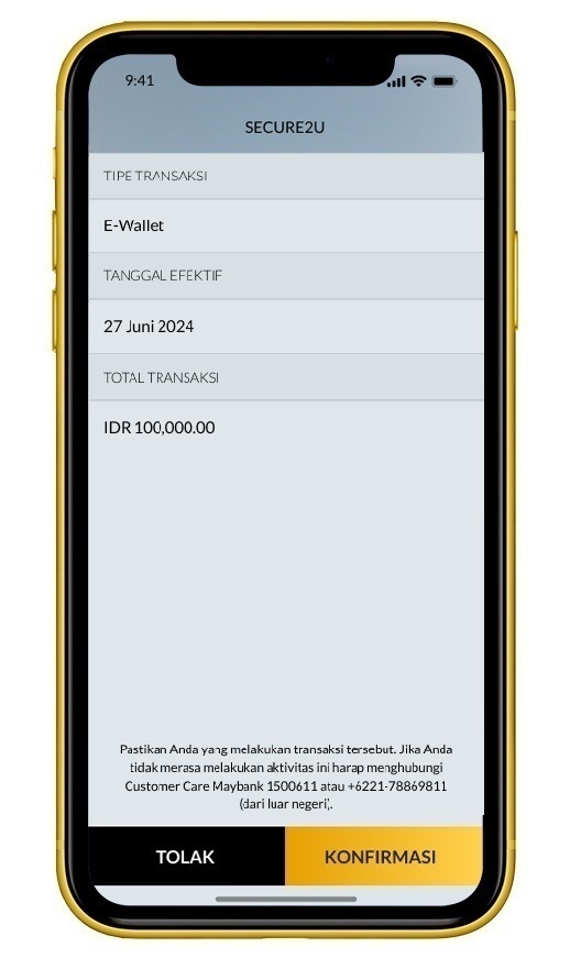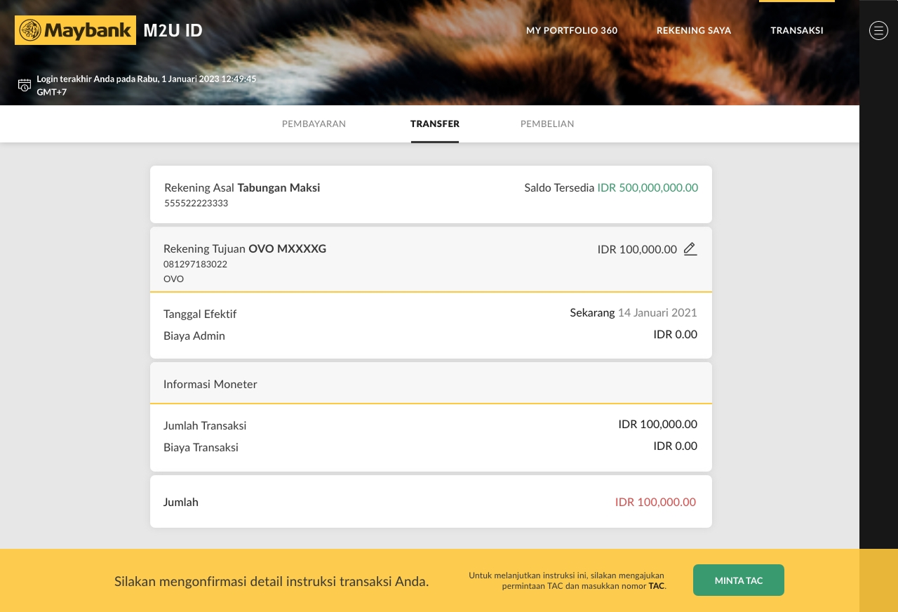 Cek kembali detail transaksi pada M2U ID App, lalu klik ‘Konfirmasi’ jika sudah sesuai.