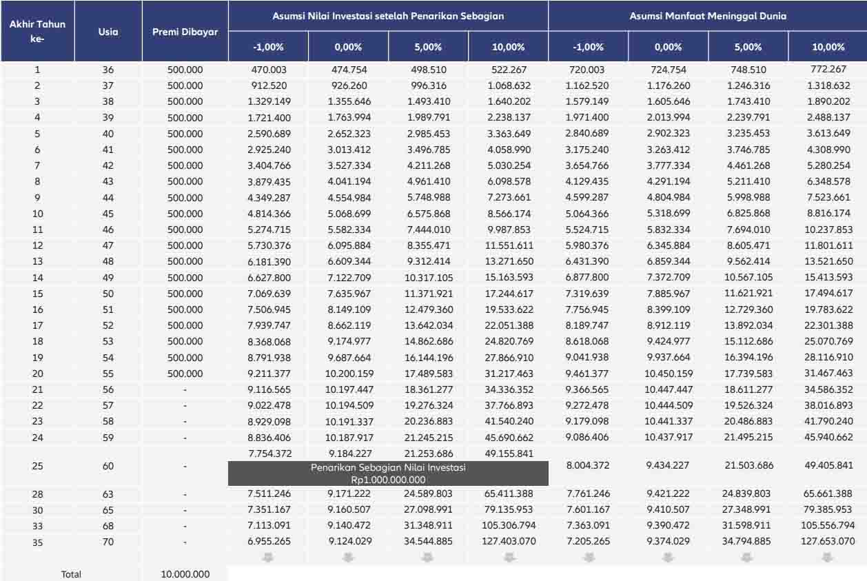 Tabel proyeksi nilai investasi dan manfaat meninggal dunia (dalam ribuan rupiah) |