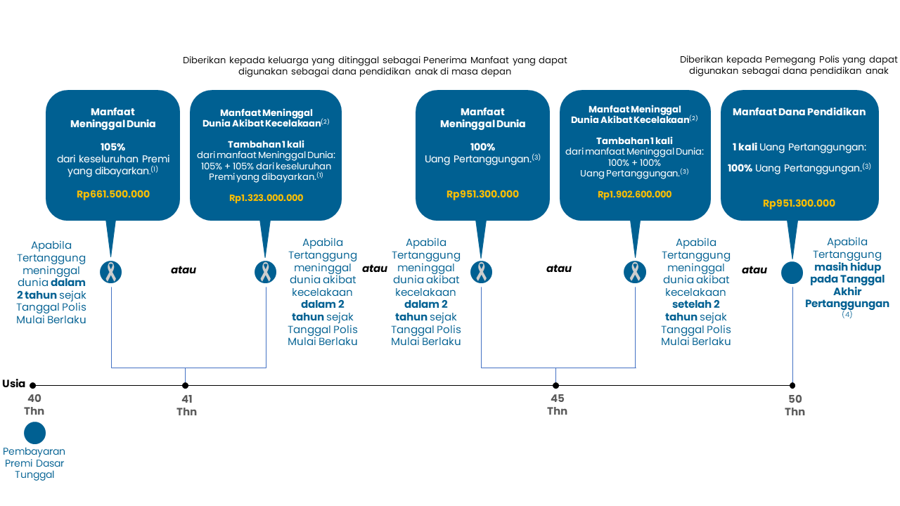 Toni (Pemegang Polis Tertanggung): Masa Asuransi: Uang Pertanggungan (UP): Rp951.300.000,- Pilihan cara pembayaran Premi: Premi Dasar Tunggal: Rp630.000.000,- |