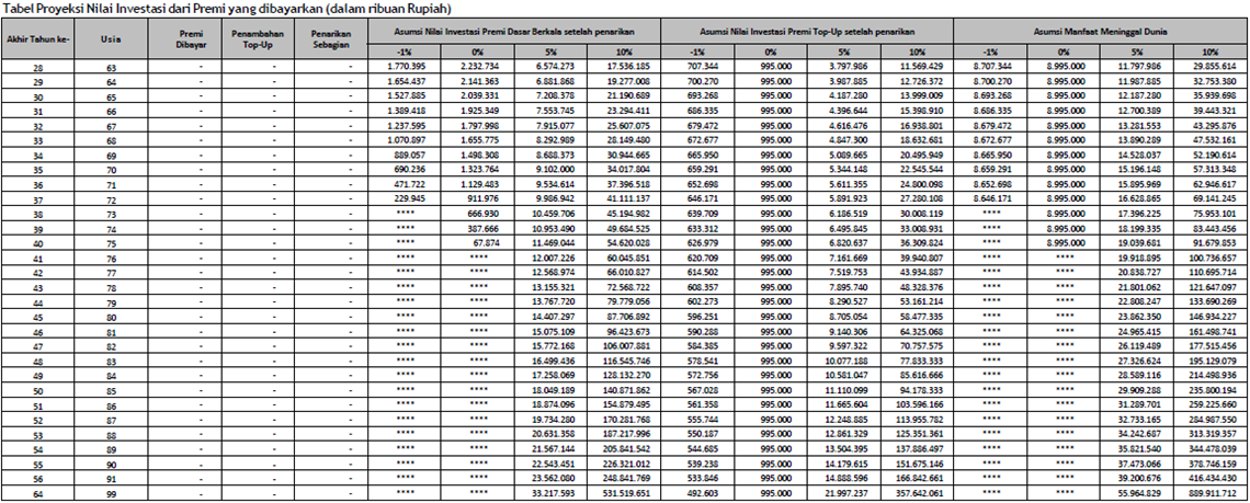 | Masa Pembayaran Premi | Sampai dengan Usia Tertanggung 99 tahun | ||||||||||||||||||