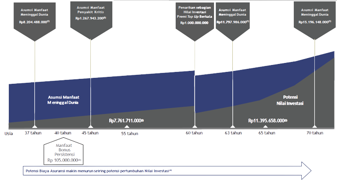 Uang Pertanggungan: Rp8.000.000.000,- Meninggal Dunia Penarikan Sebagian dari Dana Investasi Premi Top Up akhir Tahun Polis ke 25 sebesar Rp1.000.000.000,- |